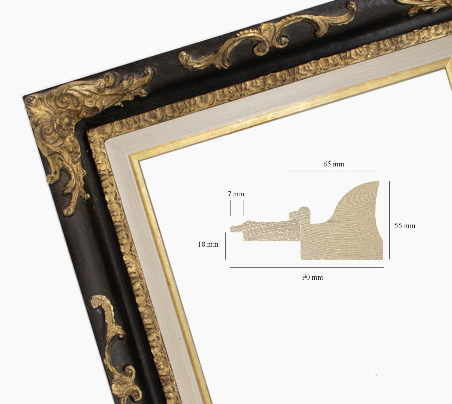 Cadre baroque noir a la feuille d'or avec marie louise, cadre finement travaillé à la main adapté aux travaux d'encadrement que vous souhaitez mettre en valeur. Cadre adapté à l'encadrement de peintures anciennes et classiques, de magnifiques miroirs peuvent également être créés.