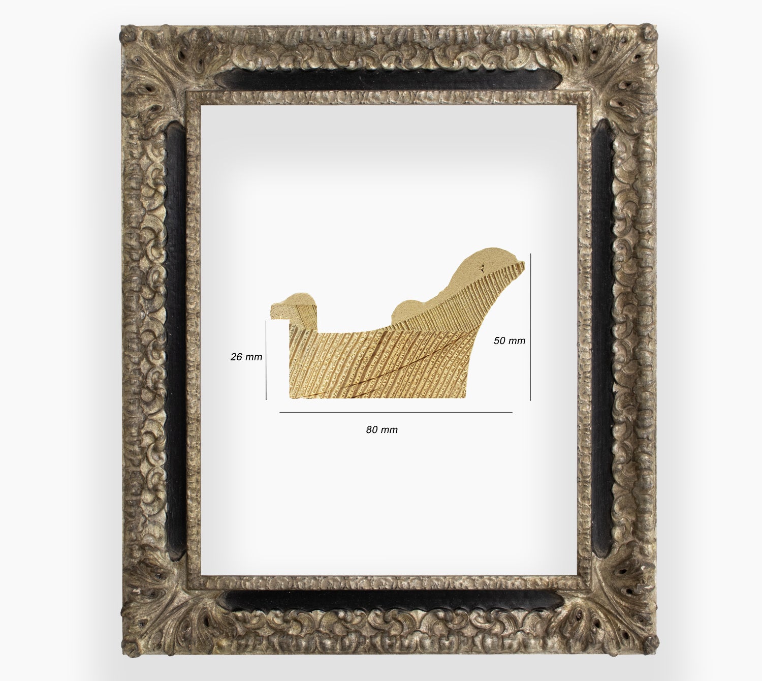 Cadre baroque a la feuille argent avec gorge noire a cirè, cadre finement travaillé à la main adapté aux travaux d'encadrement que vous souhaitez mettre en valeur.