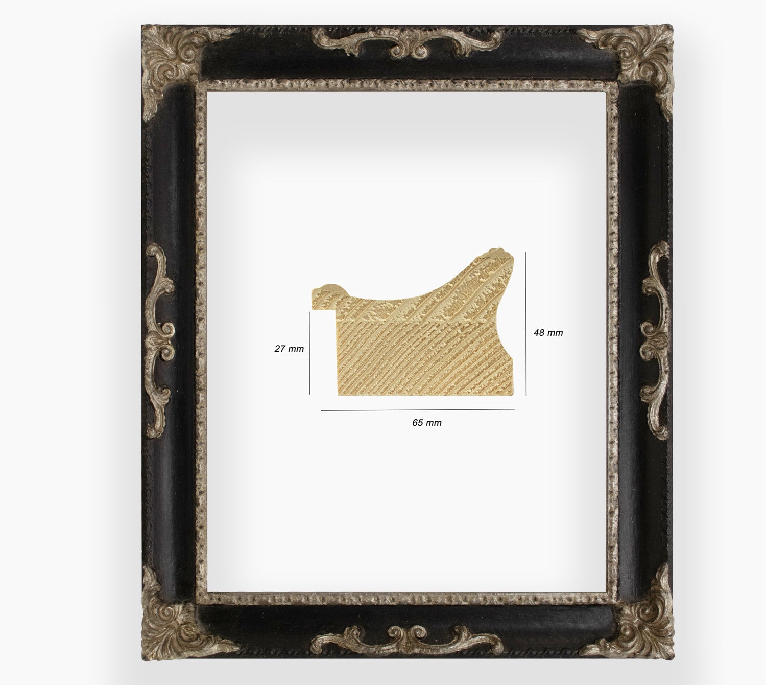 Cadre baroque a la feuille argent avec gorge noire a cirè, cadre finement travaillé à la main adapté aux travaux d'encadrement que vous souhaitez mettre en valeur. Cadre adapté à l'encadrement de peintures anciennes et classiques, de magnifiques miroirs peuvent également être créés.