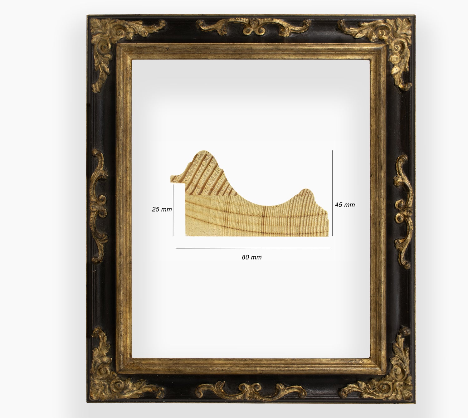 Cadre baroque a la feuille d'or avec gorge noire a cirè, cadre finement travaillé à la main adapté aux travaux d'encadrement que vous souhaitez mettre en valeur.