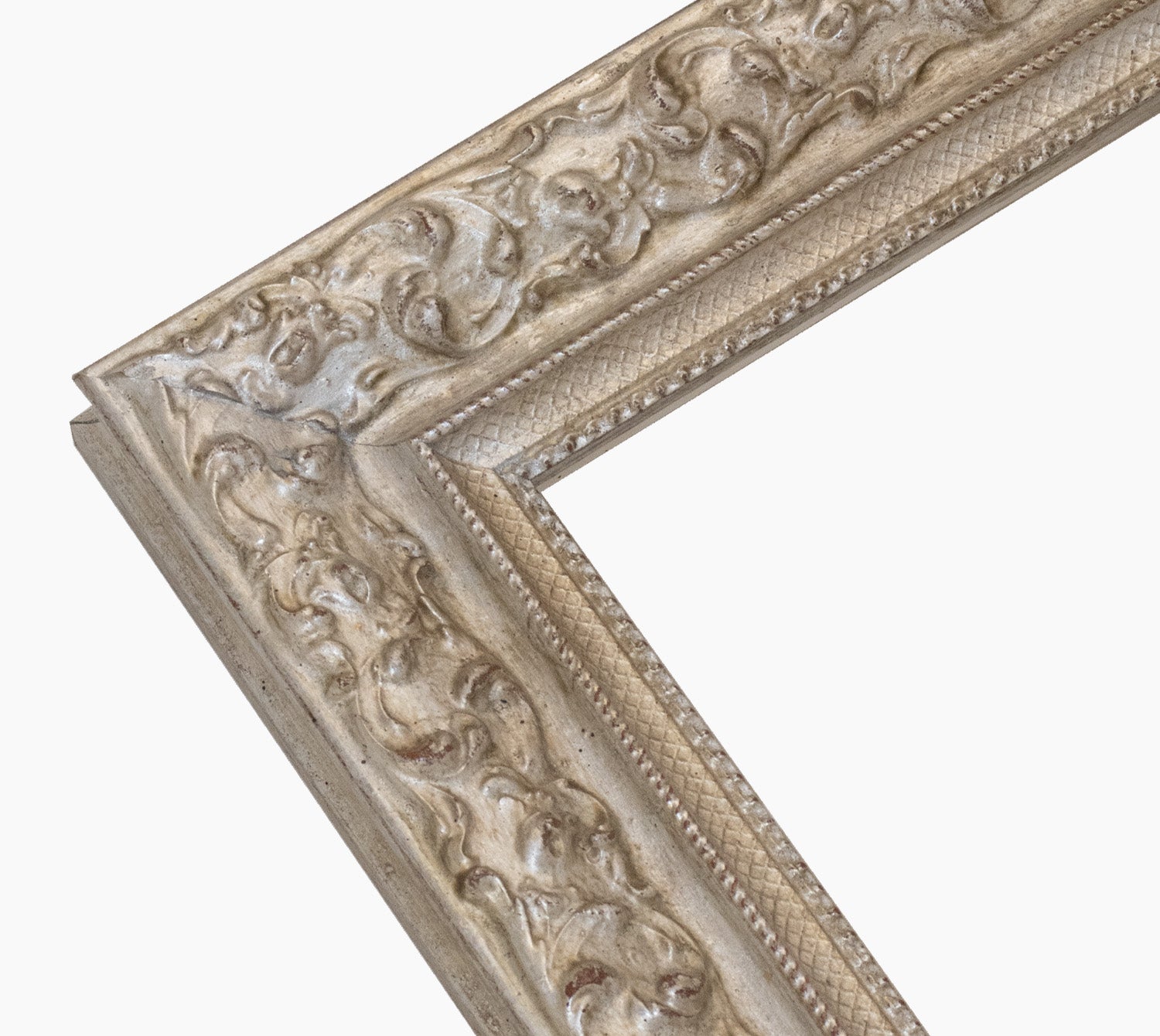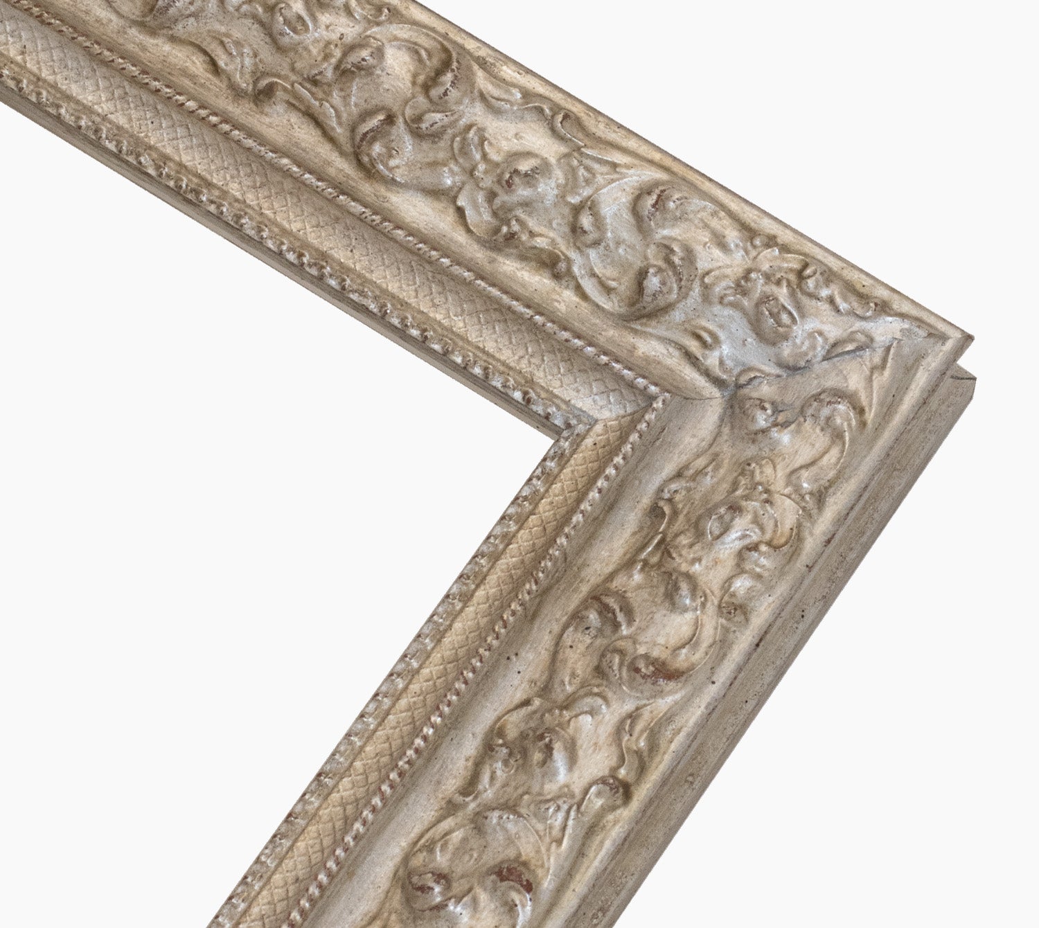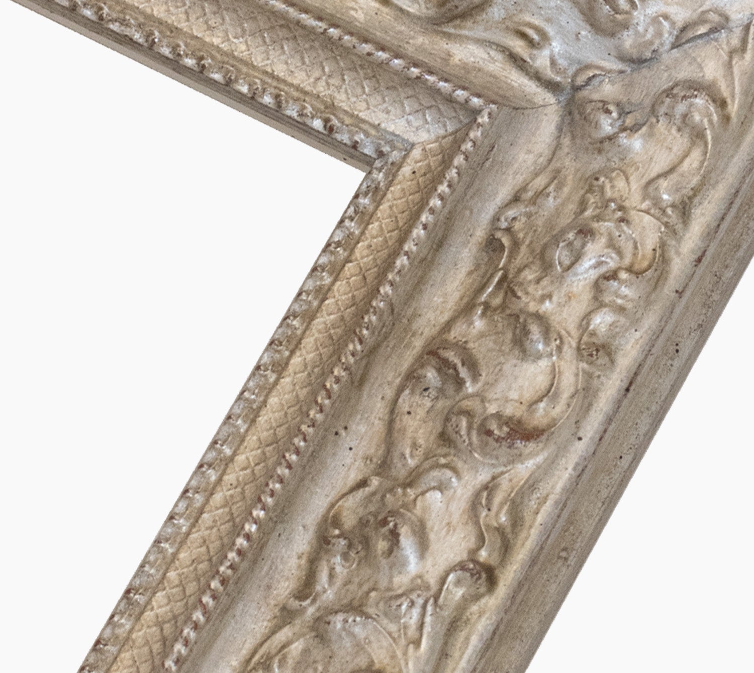 Refined baroque frame made of real wood with a textured plaster background. The frame is prepared using traditional manual techniques, the ornament is in the baroque style, the surface is finished with wax.