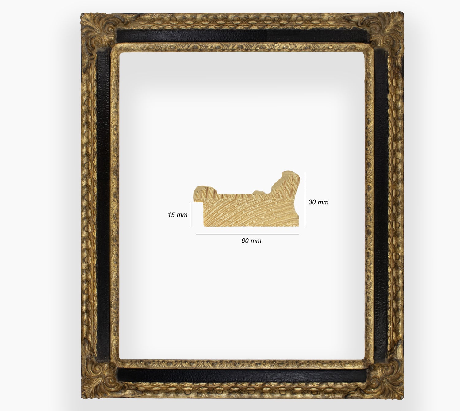 Cadre baroque a la feuille d'or avec gorge noire a cirè, cadre finement travaillé à la main adapté aux travaux d'encadrement que vous souhaitez mettre en valeur. Cadre adapté à l'encadrement de peintures anciennes et classiques, de magnifiques miroirs peuvent également être créés.